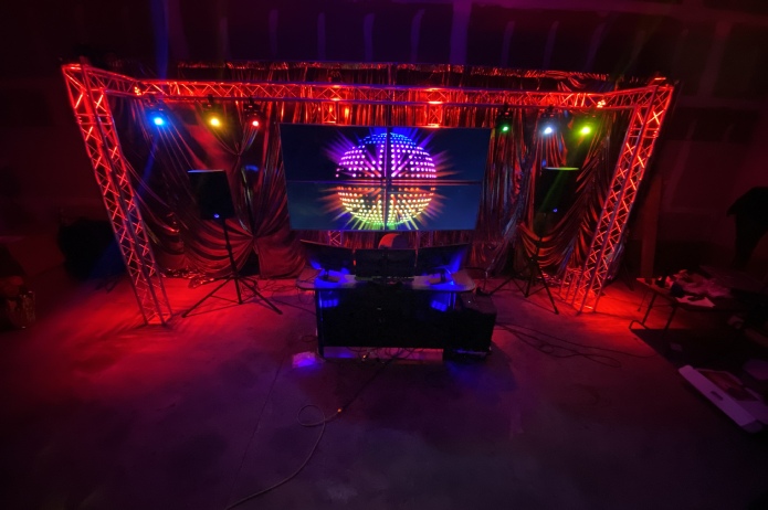 We offer professional setups for your event. Our Global trussing can span 18”8” by 9’ 8” in height by 5”deep. Our Moving Heads consists of 30W LED DMX controlled units, ADJ Aggressor LED’s along with Chauvet Mini Kintas. LED PAR’s are used for the truss warming. The four truss mounted 55” TV’s are mounted in a quad configuration. These TV’s can also be used in a stand alone configuration for directing you guests to your reception.